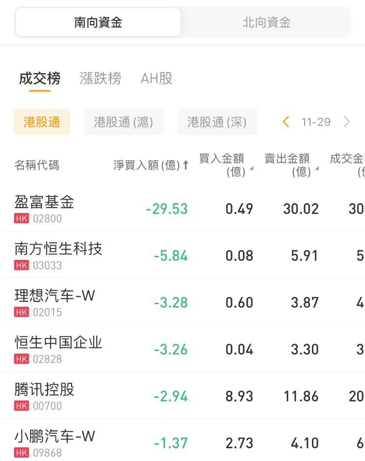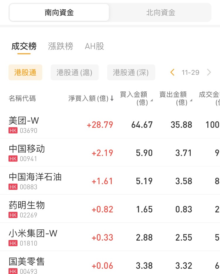 南下资金净买入美团-W 28.79亿港元,中国移动、中国海洋石油获净买入2.19亿港元、1.61亿港元;盈富基金、理想汽车-W分别遭抛售29.53亿港元、3.28亿港元。