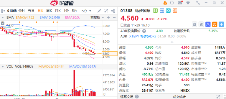 自11月7日以来,特步国际的股价就如坐上了滑梯。截至11月29日,公司股价已跌至4.56港元,刷新 2021年4月以来新低。不到一个月,公司股价跌去近40%,市值仅剩120.5亿港元,蒸发超70亿港元。若拉长时间来看,今年来特步国际累计跌幅已经近50%。