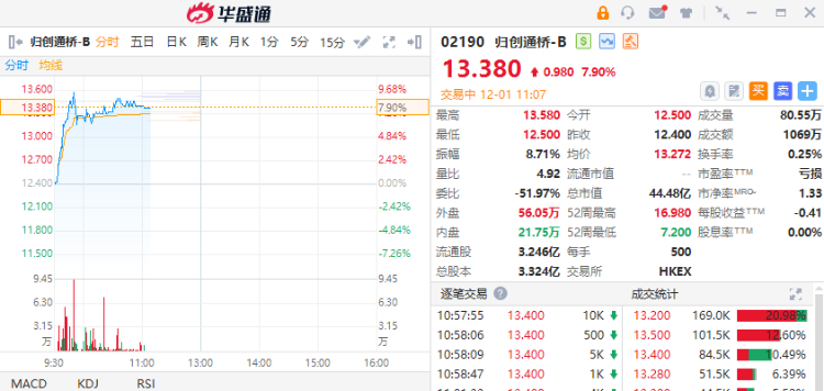 12月1日,归创通桥-B早盘走强,截至发稿,涨7.9%,报13.38港元,成交额1069万港元。