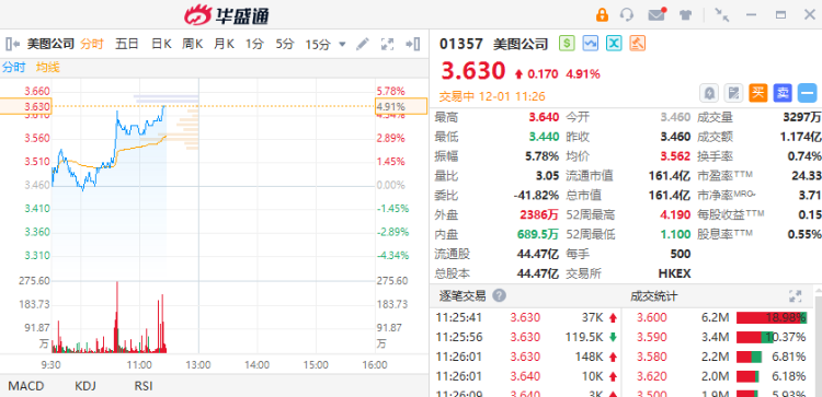 12月1日,受益AI热点刺激,美图公司走强。截至发稿,涨4.91%,报3.63港元。