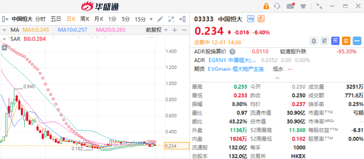 中国恒大 $03333.HK 随市走低,截至发稿,报0.234港元,跌6.4%,成交额771.8万港元。值得留意的是,下周一(12月4日)将是决定中国恒大(3333)是否清盘的一天。若中国恒大清盘,将成为香港法院历史上最大的发展商清盘案件。