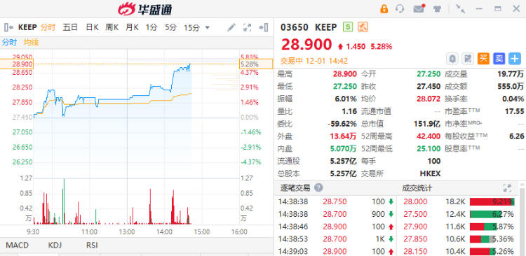 12月1日,KEEP(03650)午后走强,截至发稿,涨5.28%,报28.9港元,成交额555万港元。