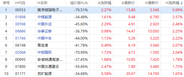截至发稿,南京熊猫电子A股涨2.27%,H股涨5.99%;中煤能源A股涨1.61%,H股现涨2.57%;中国外运A股涨2.29%,H股涨2.46%。