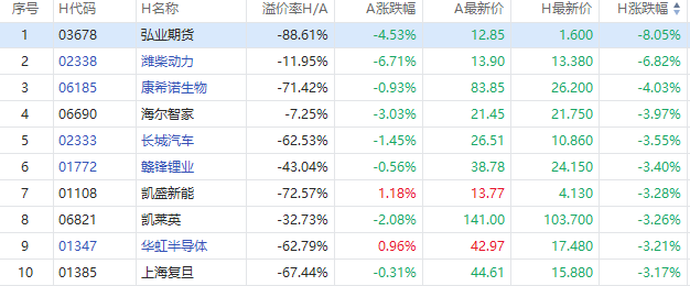 弘业期货A股跌超4%,H股现跌8.05%;潍柴动力A股跌6.71%,H股跌6.82%;康希诺生物A股跌0.93%,H股跌4.03%。