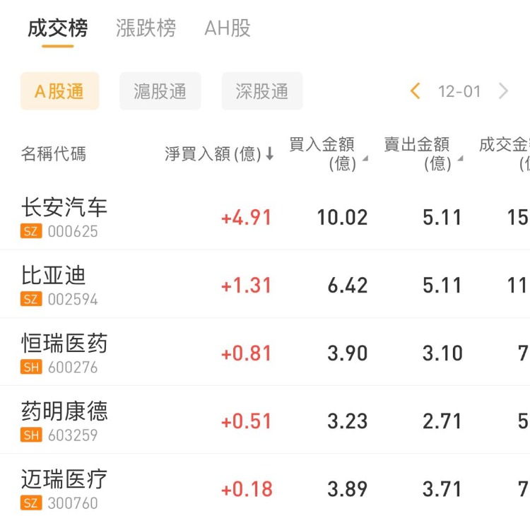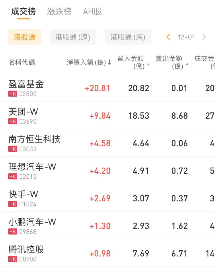 华盛资讯12月1日讯,南下资金今日净买入52.89亿港元。其中港股通(沪)净买入29.89亿港元,港股通(深)净买入23亿港元。
