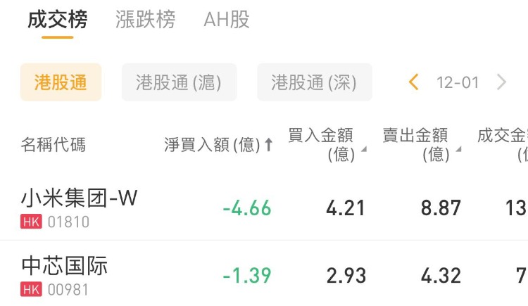 南下资金净买入盈富基金20.81亿港元,美团-W、理想汽车-W获净买入9.84亿港元、4.2亿港元;小米集团-W、中芯国际分别遭抛售4.66亿港元、1.39亿港元。
