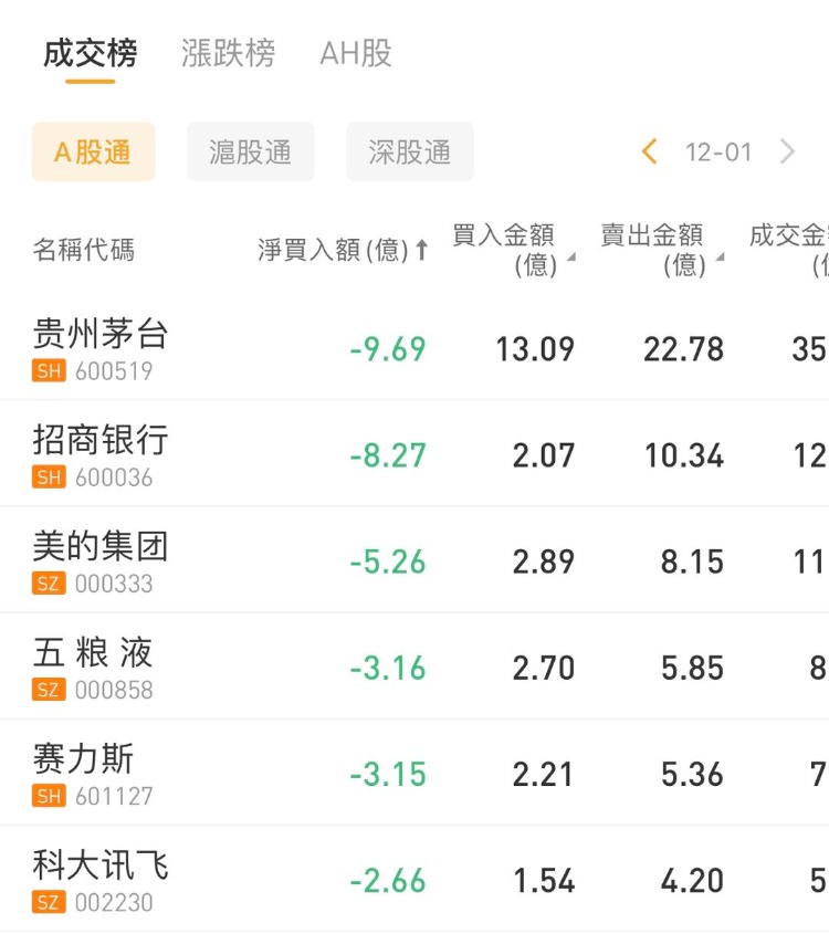 北向资金今日净卖出49.97亿元。贵州茅台、招商银行、美的集团分别获净卖出9.69亿元、8.27亿元、5.26亿元。长安汽车净买入额居首,金额为4.91亿元。