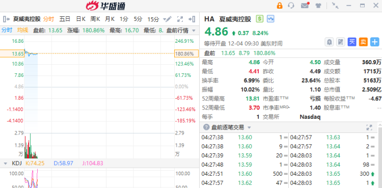 夏威夷控股 $HA 盘前暴涨180%,据悉,阿拉斯加航空同意以19亿美元现金加债务的方式收购竞争对手夏威夷控股。根据上周日的一份声明,阿拉斯加航空将以每股18美元的现金支付这笔交易,其中包括夏威夷控股约9亿美元的债务。这一报价远高于夏威夷控股截至上周五的收盘价4.86美元。
