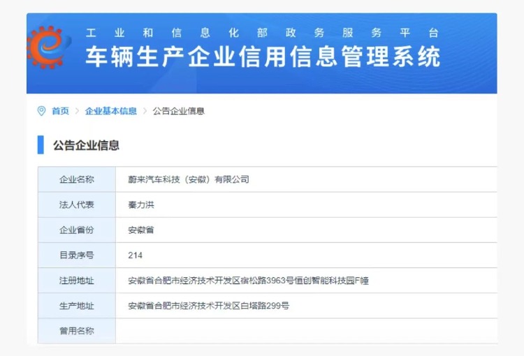12月4日,蔚来汽车科技(安徽)有限公司出现在工信部的车辆生产企业信用信息管理系统中。业界据此推测,蔚来汽车已获得独立生产资质。蔚来表示,暂时没有更多信息可以透露。