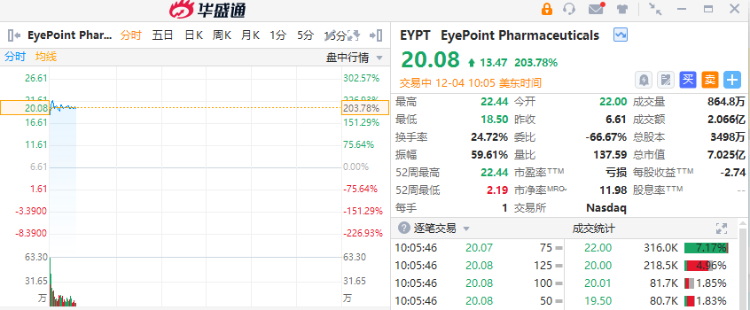 EyePoint $EYPT 暴涨200%至20.08美元,此前该公司公布了其治疗湿性年龄相关性黄斑变性或湿性AMD的 EYP-1901 2期试验取得了积极结果。