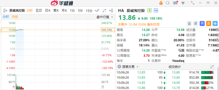 夏威夷控股 $HA 暴涨185%,据悉,阿拉斯加航空同意以19亿美元现金加债务的方式收购竞争对手夏威夷控股。根据上周日的一份声明,阿拉斯加航空将以每股18美元的现金支付这笔交易,其中包括夏威夷控股约9亿美元的债务。这一报价远高于夏威夷控股截至上周五的收盘价4.86美元。