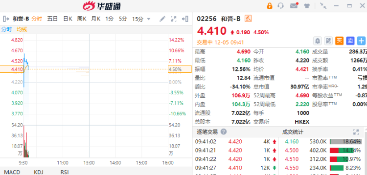 12月5日,和誉-B(02256)一度涨超7%,截至发稿,涨4.5%,报4.41港元,成交额1266万港元。