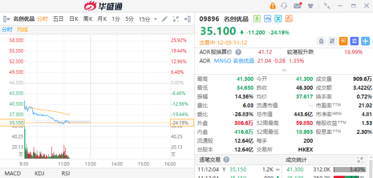 隔夜名创优品ADR( $MNSO )收跌14.4%至20.76美元,今早(5日)名创优品港股$09896.HK 亦跟随低开10.8%,现报35.1港元,跌24.19%,成交909.6万股,涉资3.422亿元。