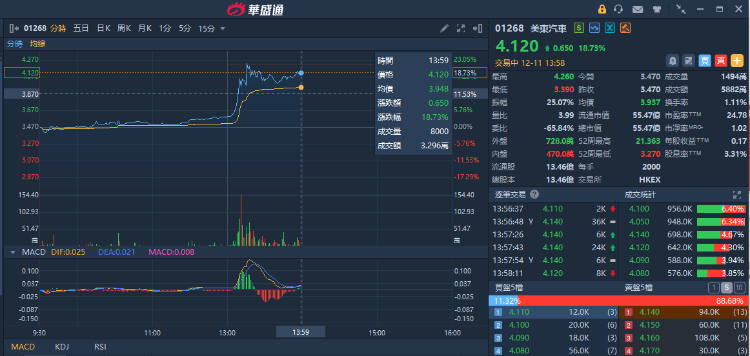 12月11日讯,港股美东汽车午后直线拉升,截至发稿逆势涨18%,最新成交额5230万港元。