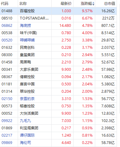 12月6日,港股餐饮股午后快速拉升,截至发稿,百福控股涨超9%,周黑鸭涨超2%,奈雪的茶、九毛九涨超1%,谭仔国际等跟涨。