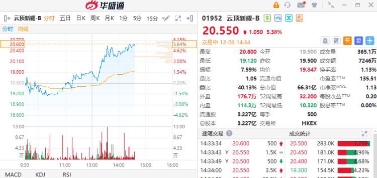 12月6日,云顶新耀-B午后走强,截至发稿,涨5.38%,报20.55港元,成交额7246万港元。