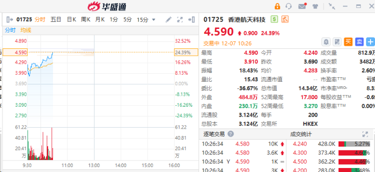 受上述消息刺激,在港股上市的香港航天科技(01725.HK)涨24.39%,报收4.59港元。