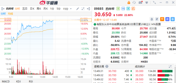 12月7日,药师帮(09885)午后走强,截至发稿,涨22.6%,报30.65港元,成交额1.318亿港元。