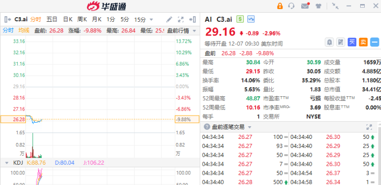 AI软件服务提供商C3.ai $AI 盘前大跌10%,现报26.28美元。公司第二财季销售额同比增长17%不及市场预期,年度亏损将进一步扩大。