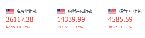 截至收盘,纳斯达克综合指数收涨1.37%,报14339.99点;标普500指数涨0.80%,报4585.59点;道琼斯指数涨0.17%,报36117.38点。对于标普和道指而言,今天的上涨也止住了今年10月以来的首个“三连跌”。