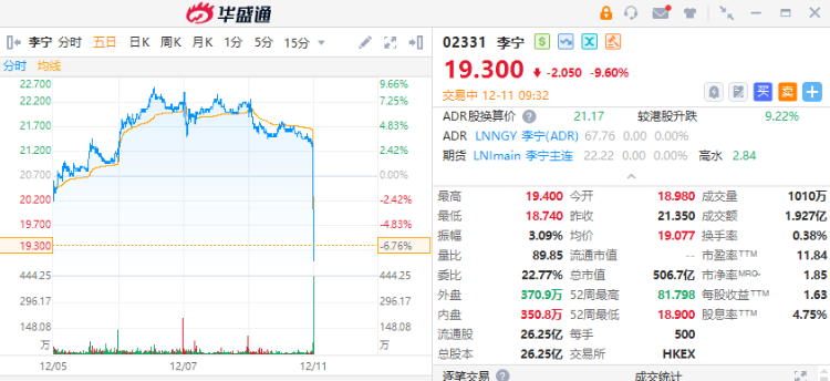 12月11日讯,港股早盘低开震荡,国货一哥李宁早盘大幅低开,截至发稿大跌10%,成交额近2亿港元。金蝶国际高开逾3%,截至发稿,逆势涨7%。