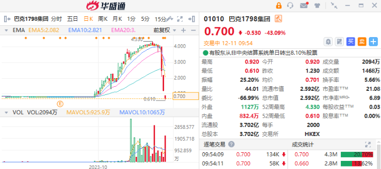 12月11日讯,港股巴克1798集团(01010)复牌暴跌47%,截至发稿,跌43.09%,报0.70港元,成交额1468万港元。