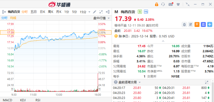 梅西百货盘前大涨近20%,消息面上,知情人士周日透露,由Arkhouse Management和Brigade Capital组成的投资财团已提出58亿美元的收购要约,拟将梅西百货私有化。