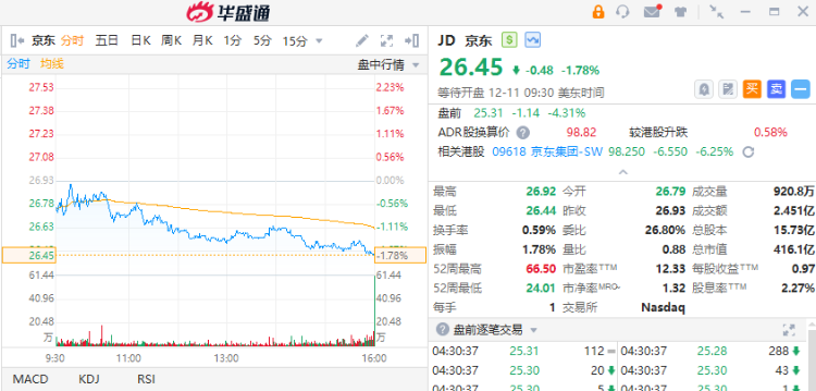 京东盘前跌超4%,此前公司被从纳斯达克100指数中移除。