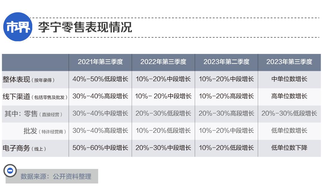 可2022年开始,李宁的业绩增速再度下滑,今年更是净利润下降。而李宁在今年10月底发布的业绩运营报表中,将销售额从二季度10%-20%的中段增长,下降成中单位数增长,并且相比于2021年同期出现大幅下滑,这也让外界对于李宁今年及后续的业绩走势,产生了一定的恐慌。