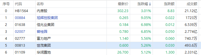 12月12日讯,港股内房股今日普遍反弹,截至发稿,旭辉控股集团涨超9%,碧桂园涨7%,华润置地、世茂集团涨超5%,恒大集团涨2%。