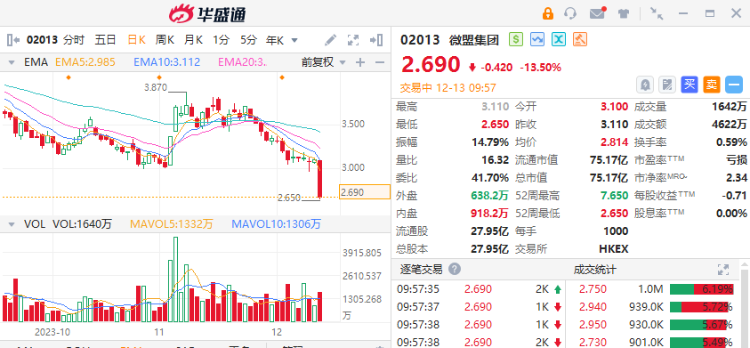 12月13日讯,港股微盟集团早盘低开低走一度跌超14%,股价现跌超13%,报2.69港元,当前成交额4622万港元。