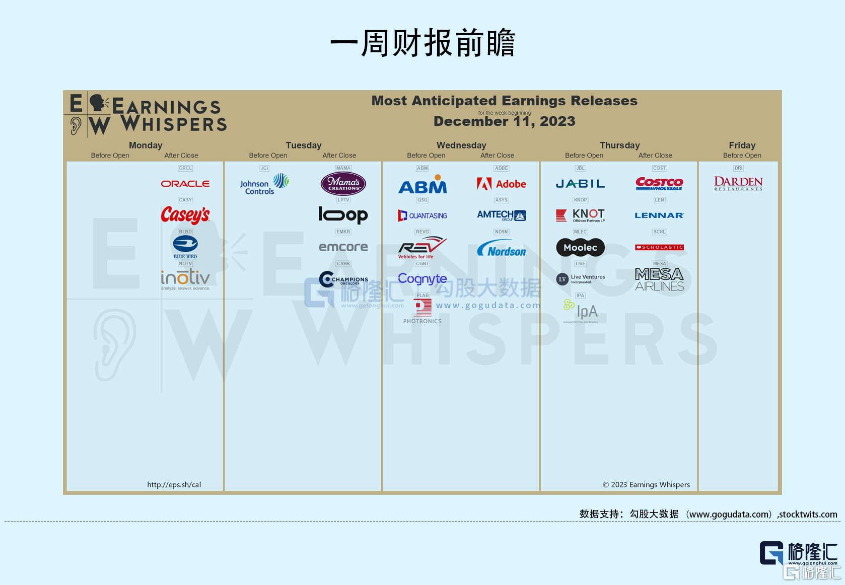 大型科技股多数收涨。苹果收涨 1.67%,在欧盟限制科技巨头权力的最新尝试中,苹果的应用商店管理音乐流媒体竞争对手的规定将受到禁令的打击,并可能面临巨额罚款。微软平收 0%,人工智能模型Phi-2的性能好于Meta等其他公司的竞争产品,并且能够在设备上运行。谷歌收涨 0.25%,谷歌表示,Gemini Pro模型现已可供企业在谷歌AI工作室和Vertex AI开发工具中使用。亚马逊涨 0.92%,英伟达涨 0.9%,Meta涨 0.16%,Meta和奢侈品墨镜公司Ray-Bans合作发布Meta Ray-Bans智能眼镜。特斯拉涨 0.96%,特斯拉人形机器人Optimus第二代(Gen 2)将于2023年12月发布;特斯拉因自动驾驶问题召回2,031,220辆车辆;SpaceX股份购入要约显示该公司估值接近1800亿美元。PFE跌6.72%,辉瑞2024年业绩指引低于预期;辉瑞收购Seagen获批,拟于本周完成交易并成立新的肿瘤部门。