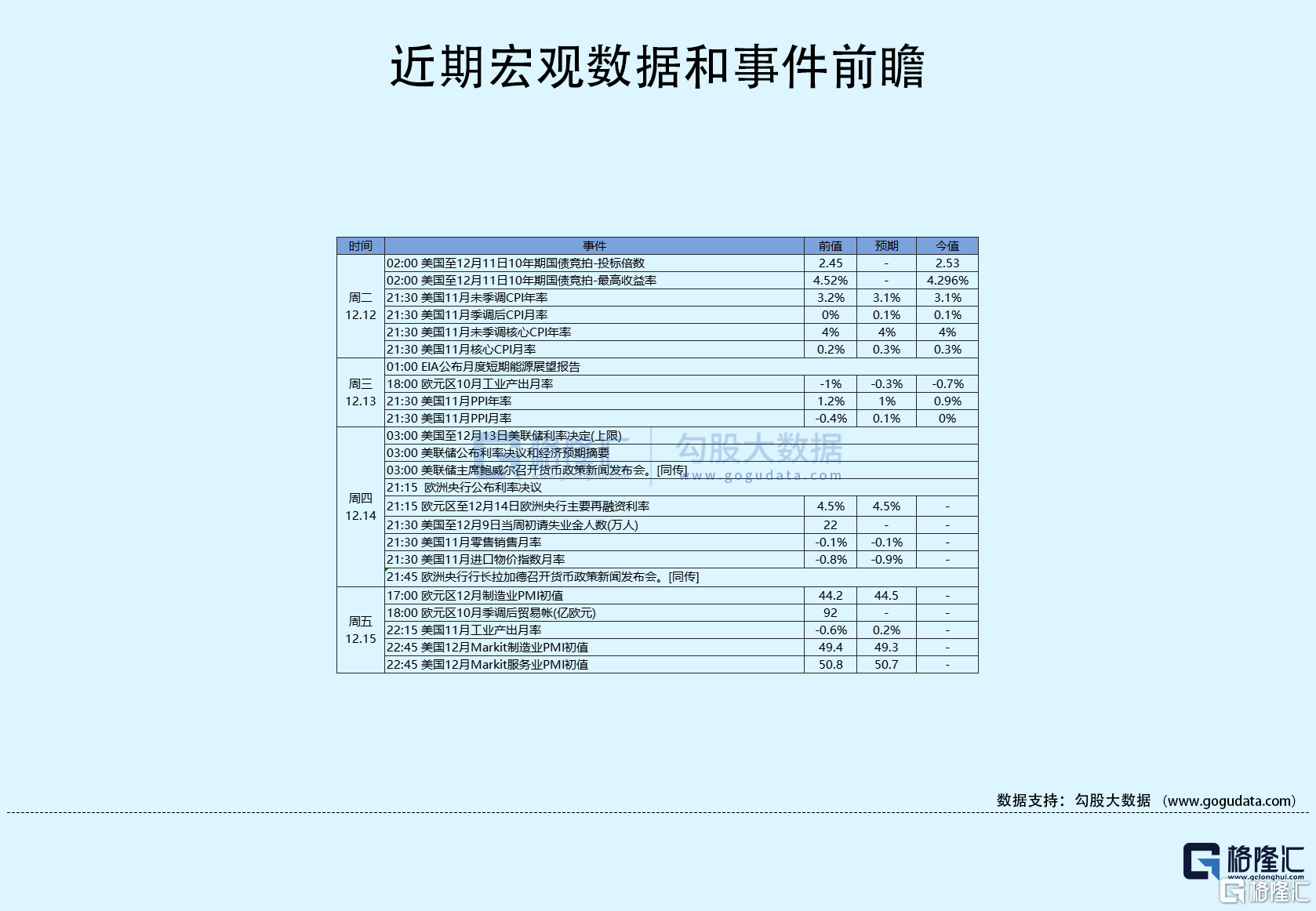 美国11月PPI年率录得0.9%,为今年6月以来新低。11月PPI月率录得0%,市场预期0.1%。英国10月GDP数据意外萎缩,交易员完全定价英国央行在2024年进行100个基点的降息。据日本共同社:日本反对党提交对内阁的不信任动议。