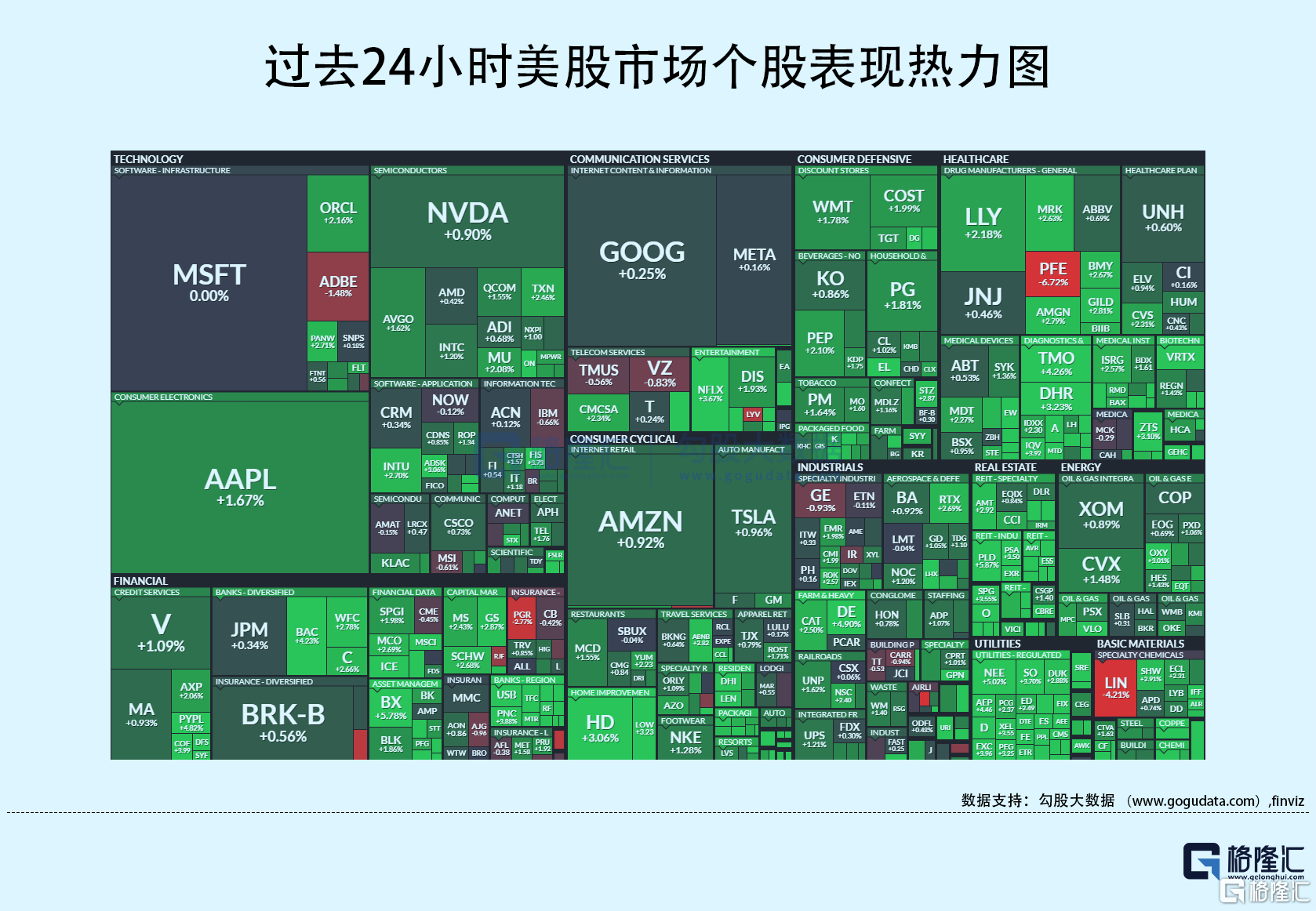 行业板块方面,标普11大板块悉数收涨:公用事业、房地产、医疗、日常消费、金融、半导体、能源、原料、工业、通讯和科技分别收涨3.78%、3.63%、1.84%、1.82%、1.61%、1.54%、1.39%、1.22%、1.11%、0.94%和0.88%。