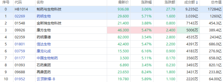 医药股方面,再鼎医药涨超8%,康龙化成、药明生物大涨6%,信达生物、康希诺生物涨超5%。