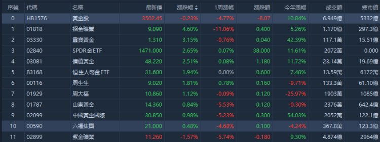 部分黄金股走高,招金矿业(01818)涨4.6%,灵宝黄金(03330)涨3.15%,山东黄金(01787)涨0.84%,中国黄金国际(02099)涨0.98%。
