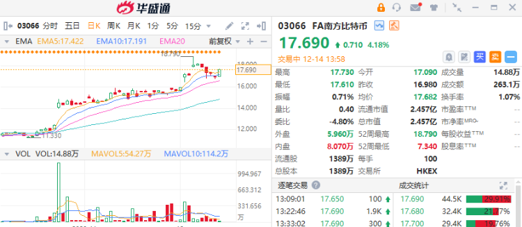 12月14日讯,港股比特币ETF $03066.HK 涨超4%,新火科技控股一度涨超8%。消息面上,美联储如期将利率维持在5.25%-5.50%的当前区间,此举标志着继 11 月、9 月和 6 月维持利率不变后,美联储今年第四次暂停加息。消息公布后,比特币反弹至4.3万美元以上。