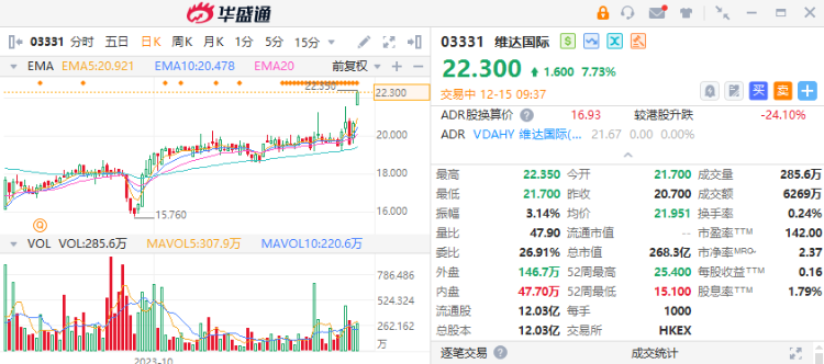 12月15日讯,受被收购消息影响,港股维达国际(03331)高开约5%,涨幅现扩大至7.73%,报22.30港元。