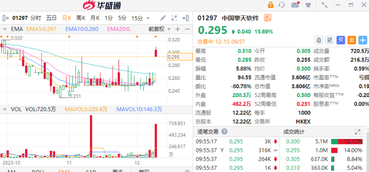中国擎天软件(01297)今日复牌上涨15.69%,现报0.295港元,成交额172.70万港元。