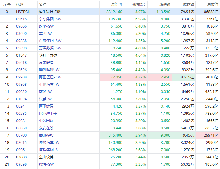 科网股多数上扬,京东集团-SW涨近7%,美团-W涨超5%,百度集团-SW、哔哩哔哩-W涨超4%,阿里巴巴-SW涨超3%,腾讯控股、快手-W涨超2%,小米集团-W跟涨。