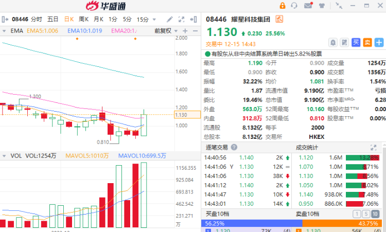 12月15日讯,港股耀星科技集团(08446)一度涨超31%,截至发稿,涨25.56%,报1.13港元,成交额1356万港元。