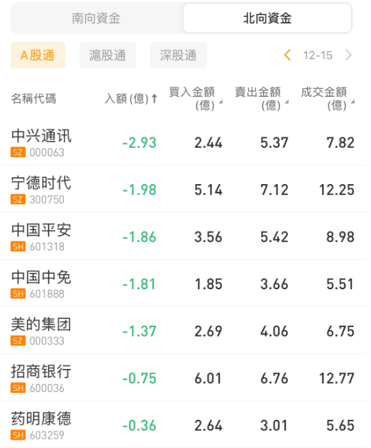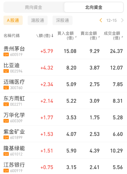 北向资金今日净卖出41.66亿元;贵州茅台、比亚迪分别获净买入5.79亿元、4.32亿元。中兴通讯净卖出额居首,金额为2.93亿元。