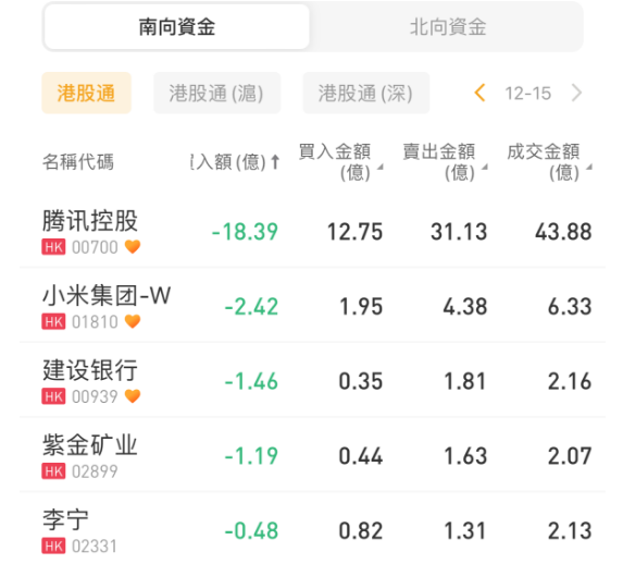 华盛资讯12月15日讯,南下资金今日净卖出39.63亿港元。其中港股通(沪)净卖出16.70亿港元,港股通(深)净卖出后22.93亿港元。