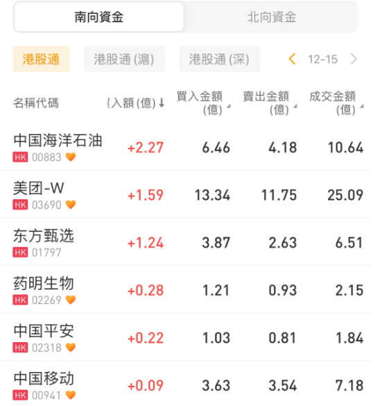 南下资金净买入中国海洋石油2.27亿港元,美团-W获净买入1.59亿港元;腾讯控股再遭大手笔抛售18.39亿港元,小米集团-W遭沽出2.42亿港元。