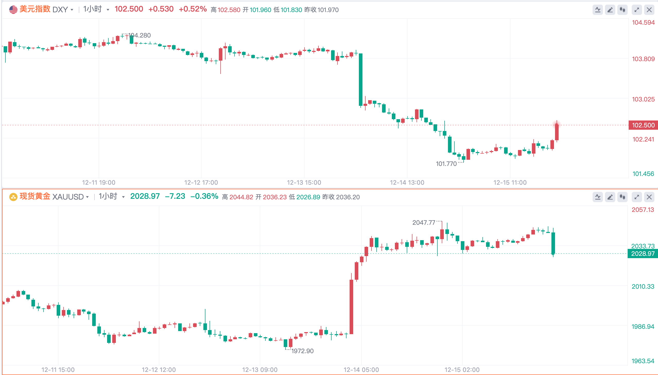 本周美元指数整体录得下跌。周初美指在104上下徘徊,周四凌晨美联储意外放鸽,释放正在讨论降息的信号,美元大幅下跌,本周最低触及101.77。