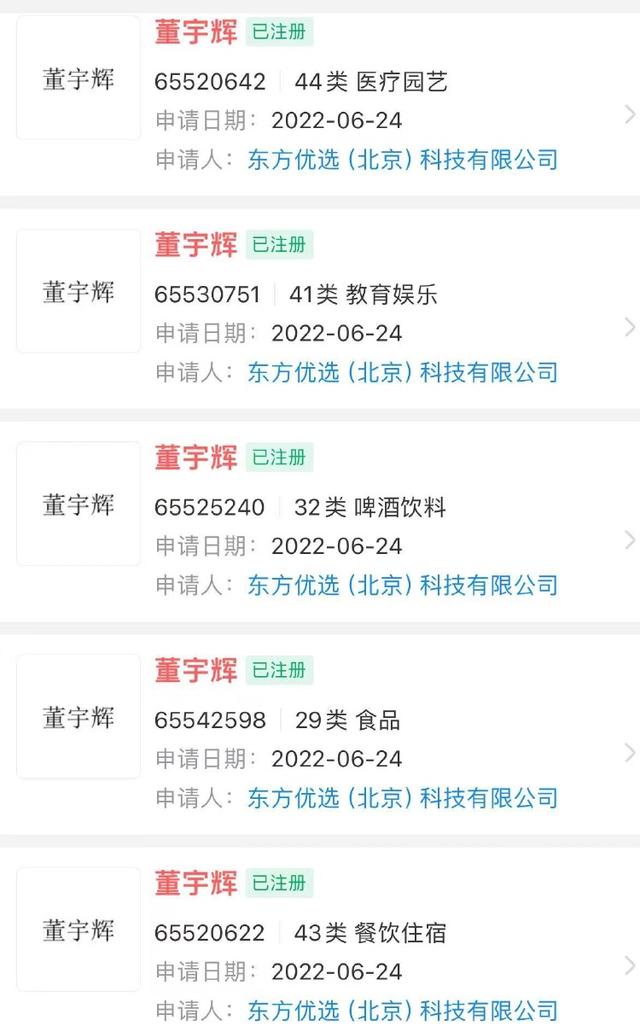 企查查App显示,“董宇辉”已被多方申请注册商标,申请人包括东方甄选关联公司东方优选(北京)科技有限公司、上海某实业公司及多位自然人,国际分类涉及广告销售、教育娱乐、食品等。值得一提的是,东方优选公司申请的多个“董宇辉”商标已成功注册,其他公司或自然人申请的商标大多已被驳回,处于无效状态。