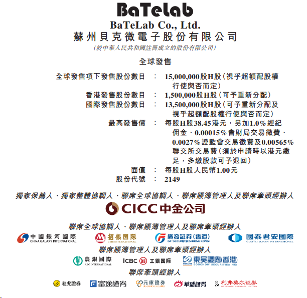 华盛资讯12月18日消息,贝克微 $02149.HK 发布公告,于2023年12月18日至2023年12月21日招股,该公司拟全球发售1500万股。每股发售价27.47-38.45港元,每手100股,预期公司股份将于2023年12月28日上市。前往新股中心,申购新股>>