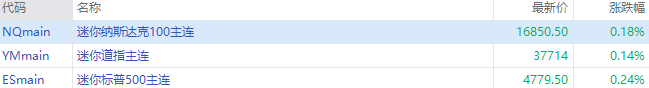 华盛资讯12月18日消息,美股三大期指盘前走强,截至发稿,纳指期货 $NQmain 涨0.18%,标普500指数期货 $ESmain 涨0.24%,道指期货 $YMmain 涨0.14%。