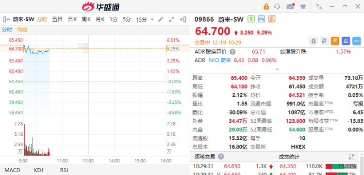 华盛资讯12月19日消息,蔚来早盘逆市走强,截至发稿,蔚来涨超5%,报64.7港元,成交额4721万港元。