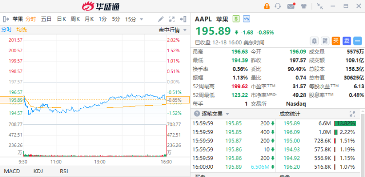 在美股持续创下新高,科技股普遍上扬之际,受消息影响,苹果股价周一收跌 0.85%报195.89美元,总市值3.05万亿美元。